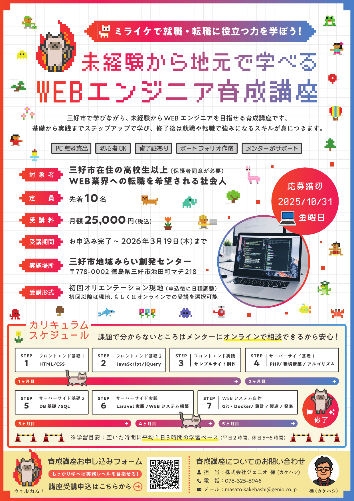 | その他 | 対象者: 三好市在住の高校生以上(高校生は保護者同意が必要) WEB業界への転職を希望する社会人(市外在住も可) 受講形式: 初回オリエンテーションは現地(申込後日程調整)、以降は現地またはオンライン受講を選択可能 締切:2025年10月31日(金) 受講期間: 申込完了 ~ 2026年3月19日(木)まで 内容: 未経験からWEBエンジニアを目指せる育成講座です。基礎から実践までステップアップで学び、終了後は就職や転職で強みになるスキルが身につきます。 |